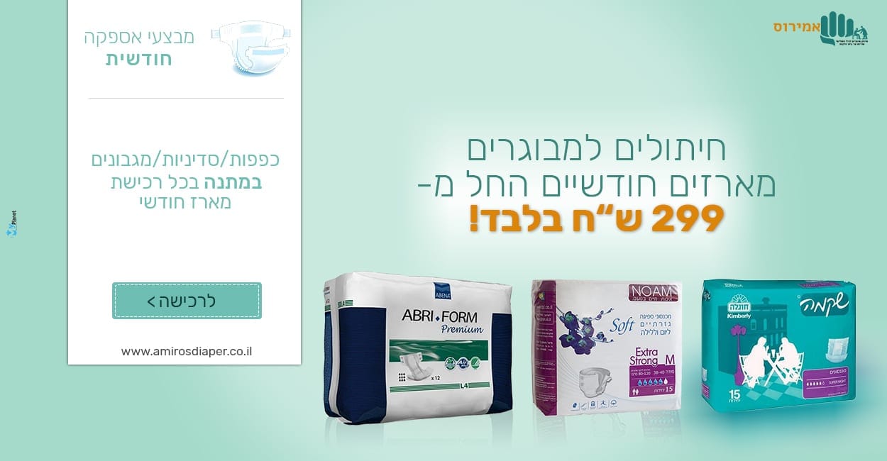 אמירוס חנות חיתולים למבוגרים מספקת מענה רחב לכל מוצרי הספיגה ואביזרי העזר. חיתולים למבוגרים בכל המידות ורמות הספיגה השונות.